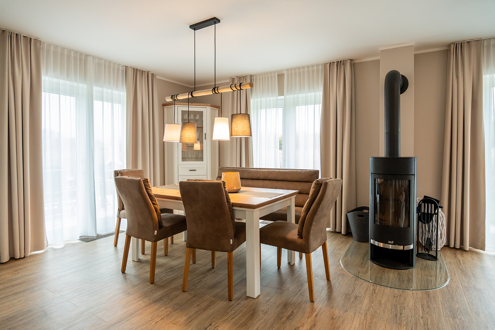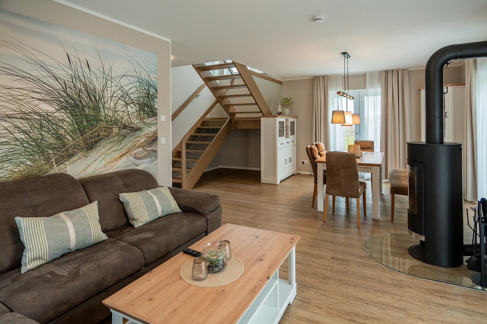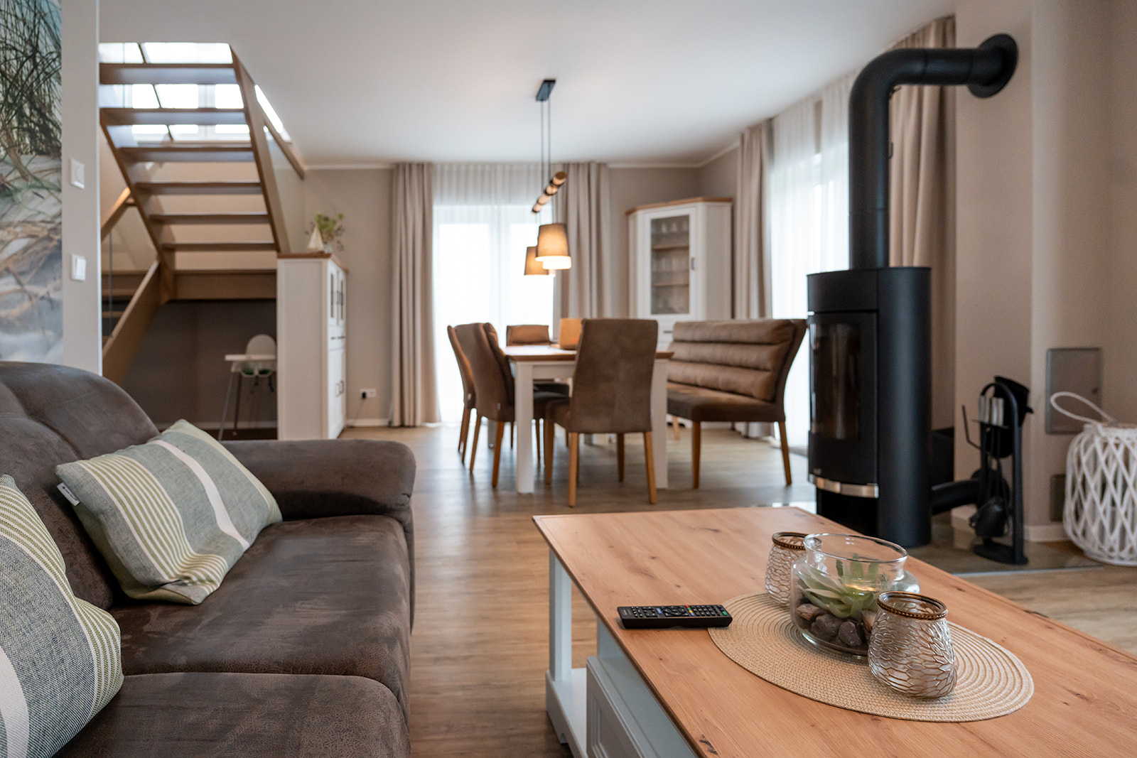 Im Zentrum des Ferienhauses befindet sich ein offener Wohn- und Essbereich, der zum Verweilen einlädt. Die vollausgestattete Küche ermöglicht die Zubereitung köstlicher Mahlzeiten, während Sie mit Ihrer Familie im Gespräch bleiben. Ein besonderes Highlight ist der Kamin im Wohnbereich, wo Sie den Tag bei einem Glas Wein ausklingen lassen können. An kühlen Abenden sorgt er für eine besonders behagliche Atmosphäre und lädt zum Kuscheln und Geschichtenerzählen ein.